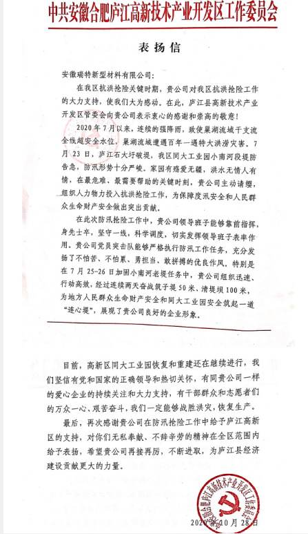 洪水無(wú)情人有情,心懷感恩勵(lì)志行。在已經(jīng)過(guò)去的抗洪搶險(xiǎn)工作中,安徽瑞特公司全體工作人員充分發(fā)揚(yáng)了不怕苦、不怕累、勇?lián)?dāng)、敢拼搏的優(yōu)良作風(fēng),出色完成了此次抗洪搶險(xiǎn)任務(wù),得到了合肥廬江縣高新技術(shù)產(chǎn)業(yè)開(kāi)發(fā)區(qū)高度認(rèn)可,并為安徽瑞特送來(lái)了表?yè)P(yáng)信。