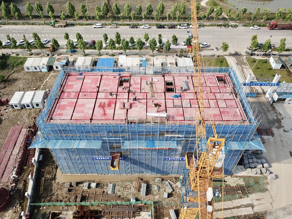 技術(shù)研發(fā)樓完成第四層主體結(jié)構(gòu)施工,正在進(jìn)行五層梁底板、頂板鋪設(shè);