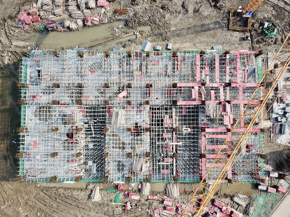 1#廠房(混凝土生產(chǎn)線)已完成一層主體結(jié)構(gòu)施工,正在進(jìn)行二層滿堂架搭設(shè)、梁底板安裝;