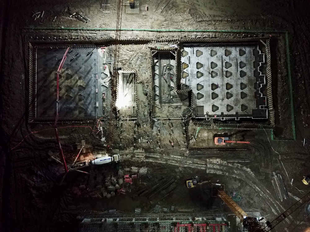 2#廠房正在進(jìn)行高倉東區(qū)承臺(tái)筏板澆筑施工,西區(qū)及中區(qū)廊道處組織班組加班加點(diǎn)進(jìn)行承臺(tái)鋼筋綁扎;