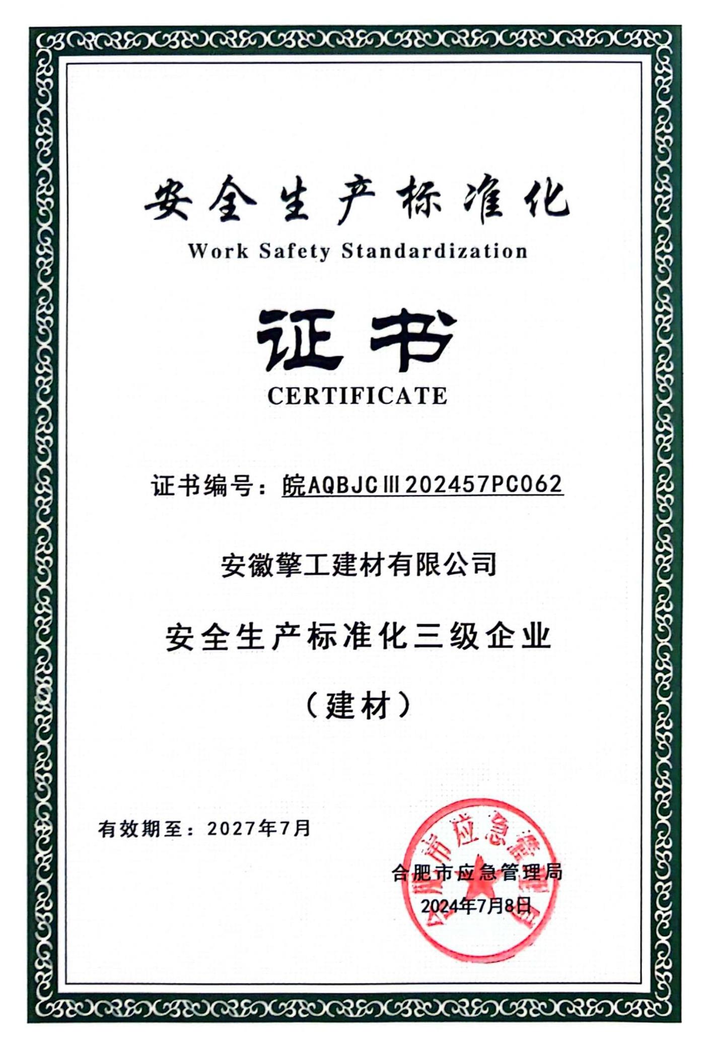 2024年7月8日,安徽擎工建材有限公司取得合肥市應(yīng)急管理局頒發(fā)的“安全生產(chǎn)標(biāo)準(zhǔn)化三級(jí)企業(yè)(建材)”證書(shū),標(biāo)志著擎工建材公司的安全生產(chǎn)管理水平和市場(chǎng)競(jìng)爭(zhēng)力邁上了新臺(tái)階。