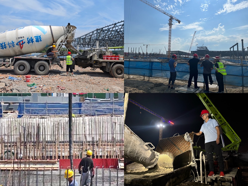 在大眾產(chǎn)業(yè)園施工一線,公司駐場保供人員日夜奮戰(zhàn),克服高溫,忙碌的身影穿梭在施工現(xiàn)場的各個角落。他們的皮膚被太陽曬得通紅,汗水浸透衣衫,“烤”干了,又濕了,再次“烤”干,在全體人員的共同努力下,僅用了20小時,就完成了3822方混凝土澆筑工作,圓滿高效的完成澆筑任務(wù),用行動贏得項目優(yōu)質(zhì)好評。