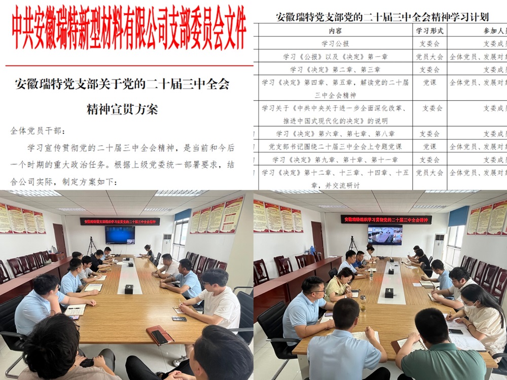 安徽瑞特為深入貫徹落實黨的二十屆三中全會精神,進一步落實上級黨委各項重要決策部署,近日來,黨支部多措并舉,迅速掀起學習宣傳貫徹全會精神的熱潮,準確把握進一步全面深化改革的重大舉措,做到學深悟透,入腦入心,努力在公司高質量發(fā)展新征程上展現(xiàn)新作為。