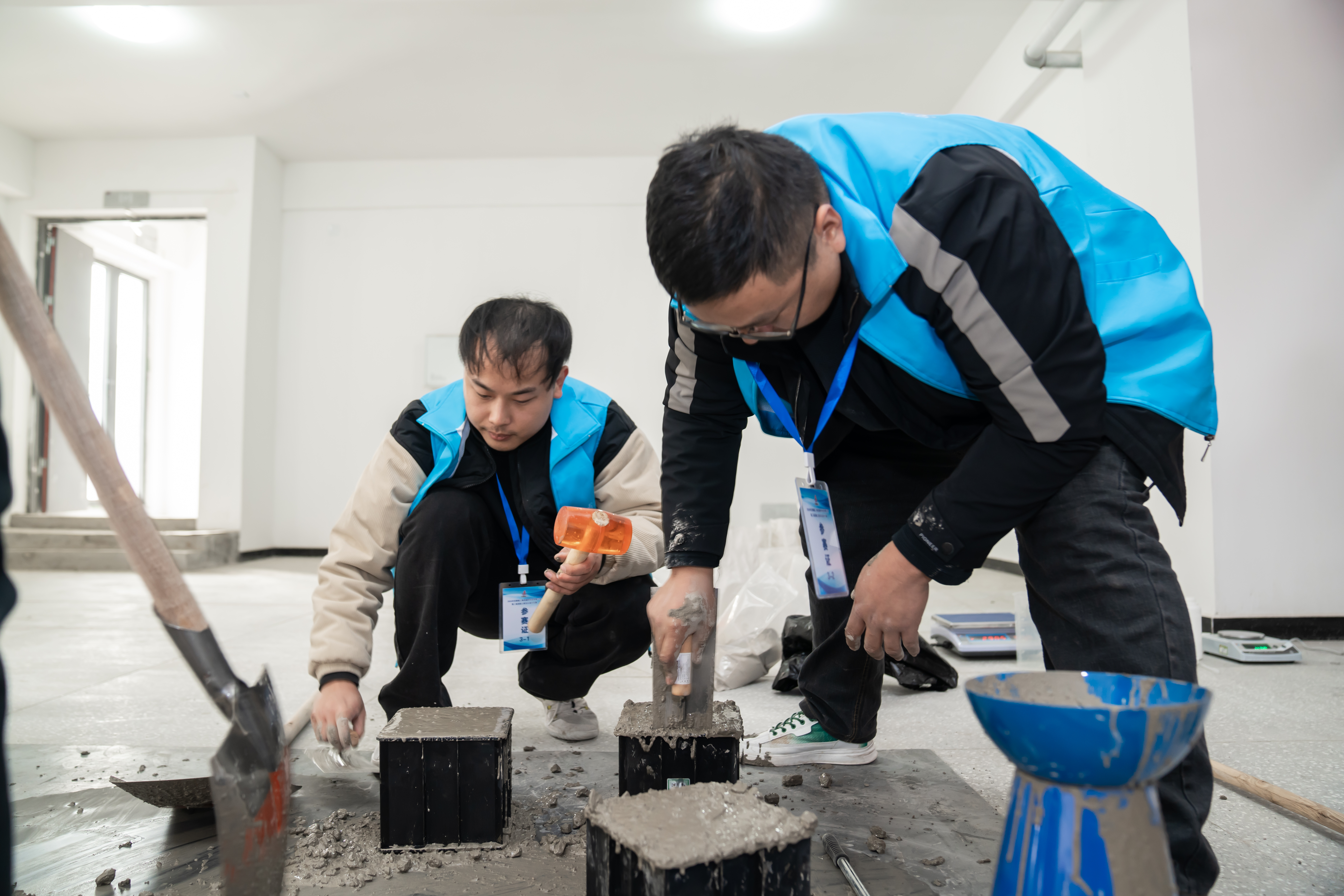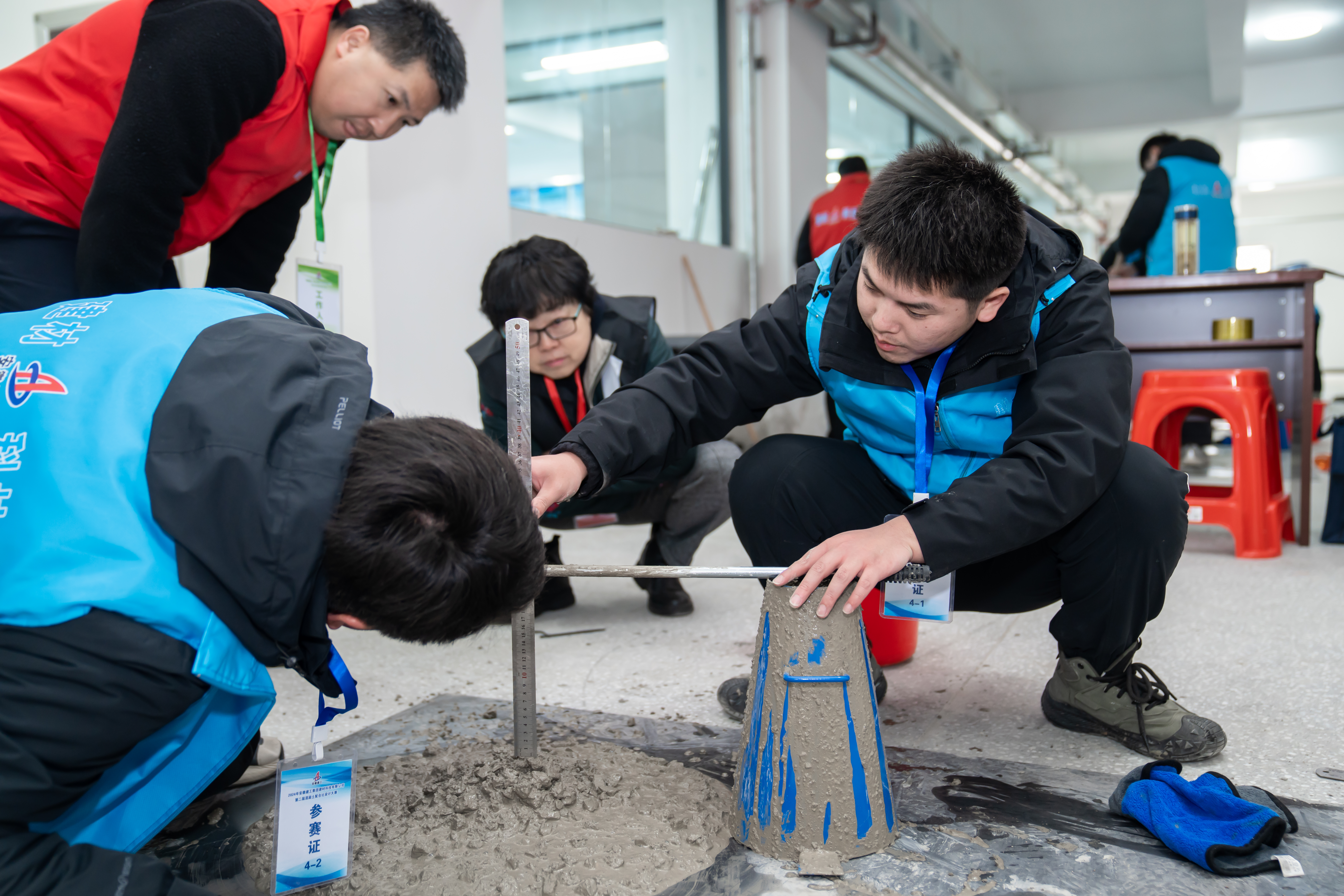 技能實(shí)操比賽采用手工拌制混凝土的方法進(jìn)行,評判內(nèi)容為:混凝土各種原材料的計(jì)量規(guī)范性、混凝土拌制的合理性以及拌和物主要性能試驗(yàn)的規(guī)范性和準(zhǔn)確性。試驗(yàn)項(xiàng)目為:坍落度、擴(kuò)展度,離析與泌水目測,立方體抗壓強(qiáng)度試件等。競賽結(jié)果將在測試完混凝土28d立方體抗壓強(qiáng)度后經(jīng)綜合評分后,由組委會再公布大賽最終排名。