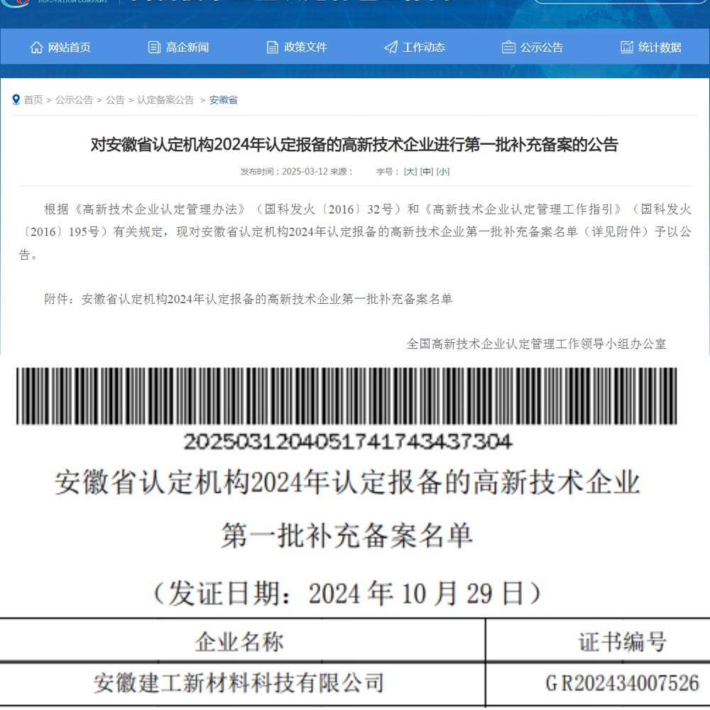 安徽建工新材料科技有限公司通過高新技術(shù)企業(yè)認定