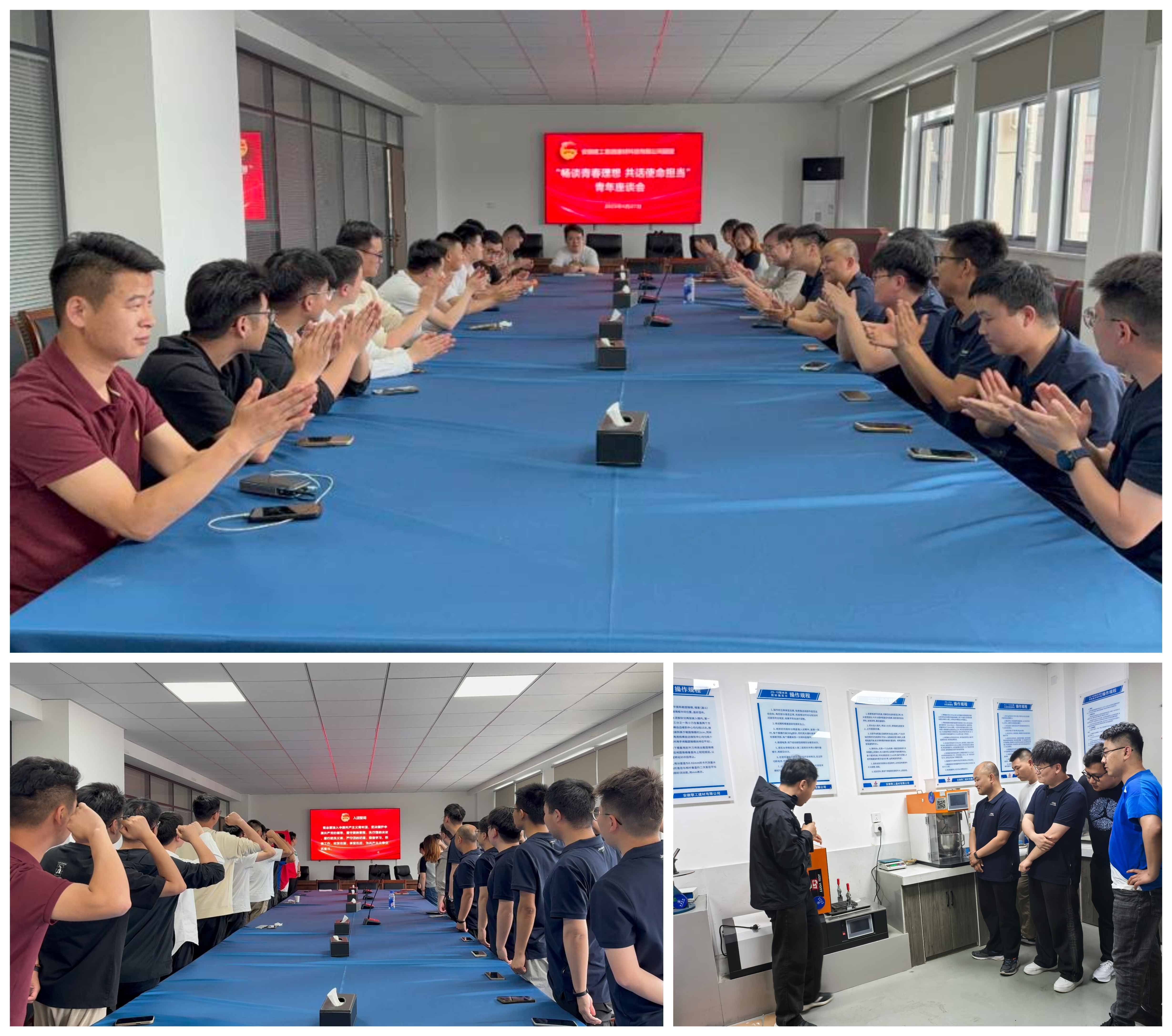 暢談青春理想,共話使命擔(dān)當(dāng)?;顒?dòng)第二站來(lái)到安徽瑞特(擎工建材),團(tuán)員青年們集體觀看五四主題微電影《青春》,重溫入團(tuán)誓詞,以“暢談青春理想,共話使命擔(dān)當(dāng)”為主題開(kāi)展座談交流,最后參觀了試驗(yàn)室。