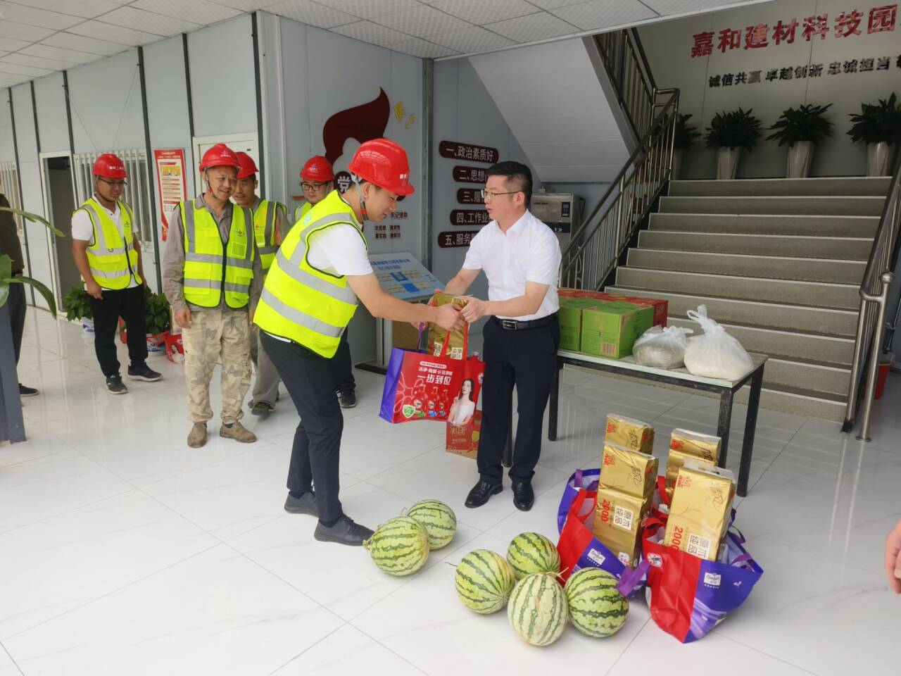 朱明歡深入嘉和建材科技園生產(chǎn)一線,看望慰問堅守崗位的職工,并送去礦泉水、花露水、綠豆、白糖等防暑降溫物資,傳遞公司對高溫作業(yè)員工的深切關(guān)懷。