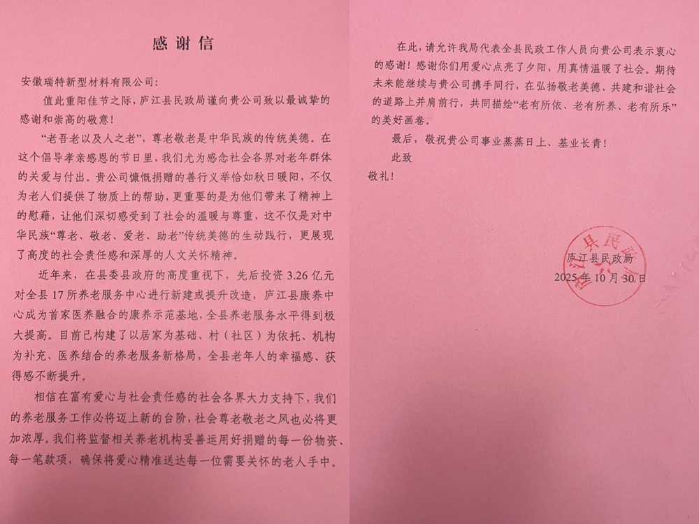 近日,安徽建工瑞特新材料科技有限公司收到來自廬江縣民政局的感謝信,對(duì)我司在重陽佳節(jié)期間開展的愛心敬老行動(dòng)予以表彰和高度肯定。