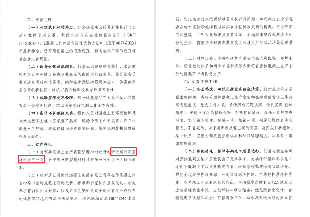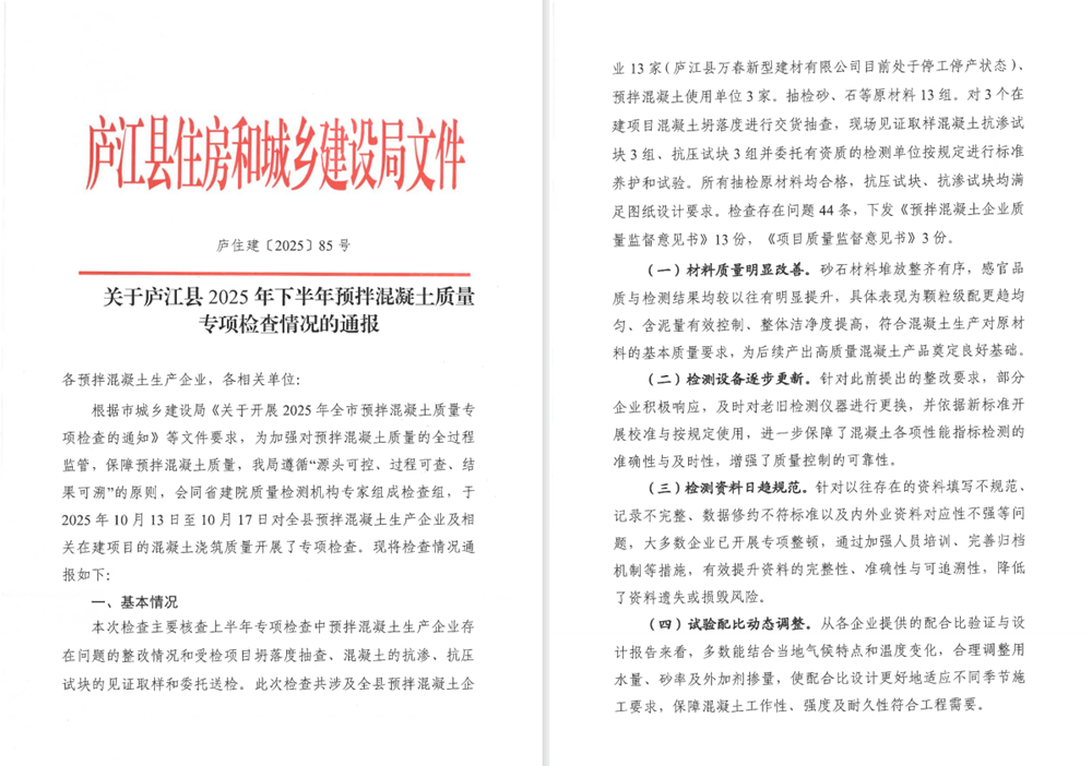 近日,廬江縣住房和城鄉(xiāng)建設(shè)局發(fā)布《關(guān)于廬江縣2025年下半年預(yù)拌混凝土質(zhì)量專項檢查情況的通報》,安徽建工瑞特新材料科技有限公司憑借卓越的質(zhì)量管理表現(xiàn)再獲通報表揚,繼今年四月獲評后,此次再獲表彰,實現(xiàn)質(zhì)量榮譽"雙豐收"。