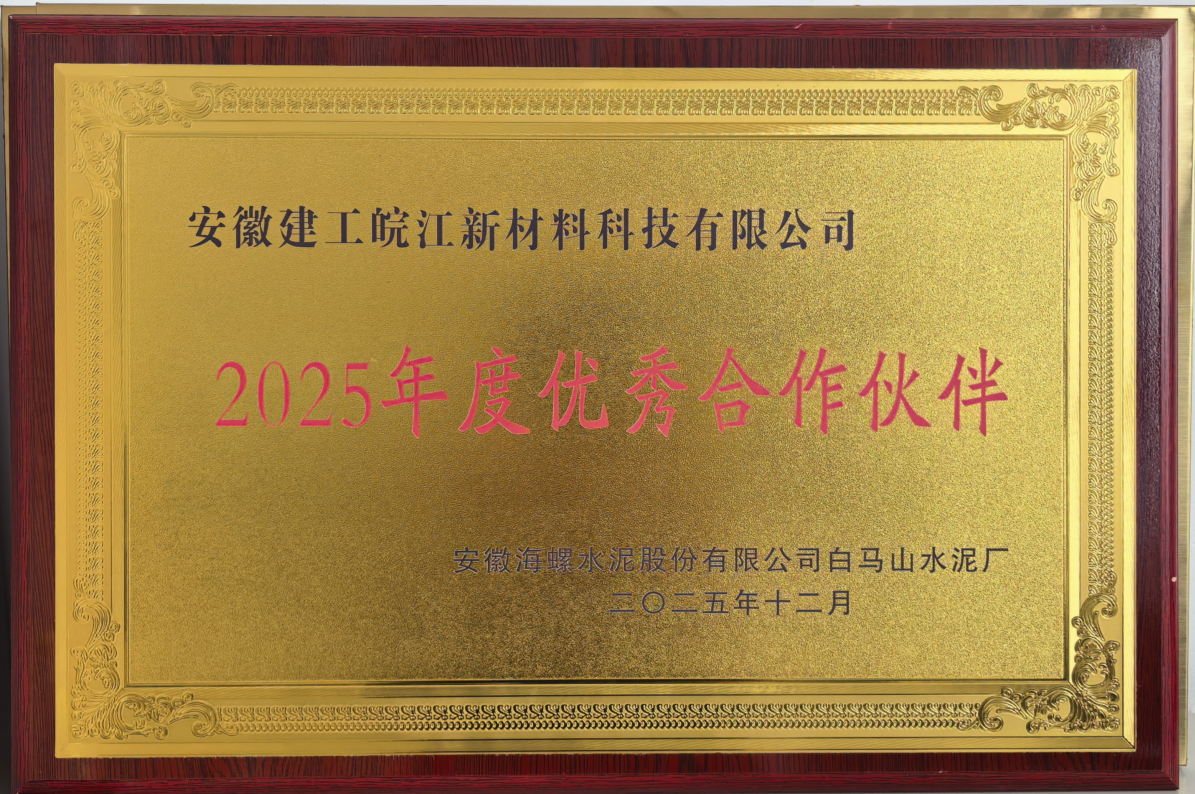 近日,建工皖江新材被安徽海螺水泥股份有限公司白馬山水泥廠授予“2025年度優(yōu)秀合作伙伴”榮譽(yù)稱號(hào)。