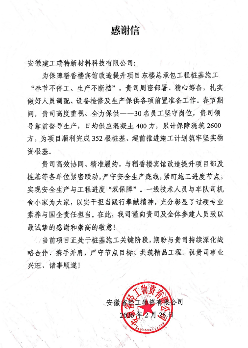 近日,建工瑞特新材收到稻香樓賓館改造提升項(xiàng)目發(fā)來的感謝信,對建工瑞特新材在春節(jié)期間堅(jiān)守崗位、全力保障項(xiàng)目混凝土供應(yīng)給予高度肯定和誠摯感謝。