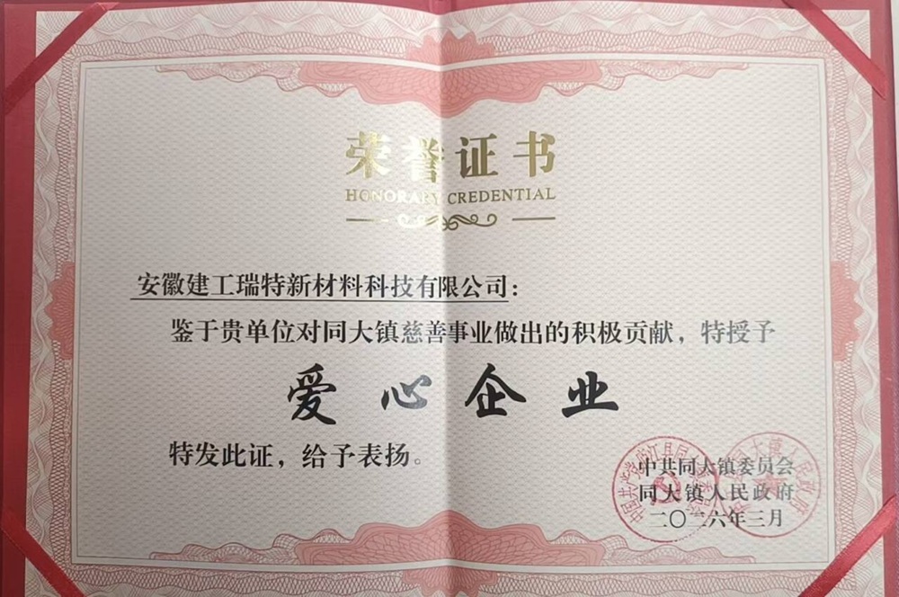 近日,建工瑞特新材憑借在志愿服務(wù)和社會(huì)公益領(lǐng)域的突出貢獻(xiàn),被同大鎮(zhèn)人民政府授予“愛(ài)心企業(yè)”稱號(hào)。