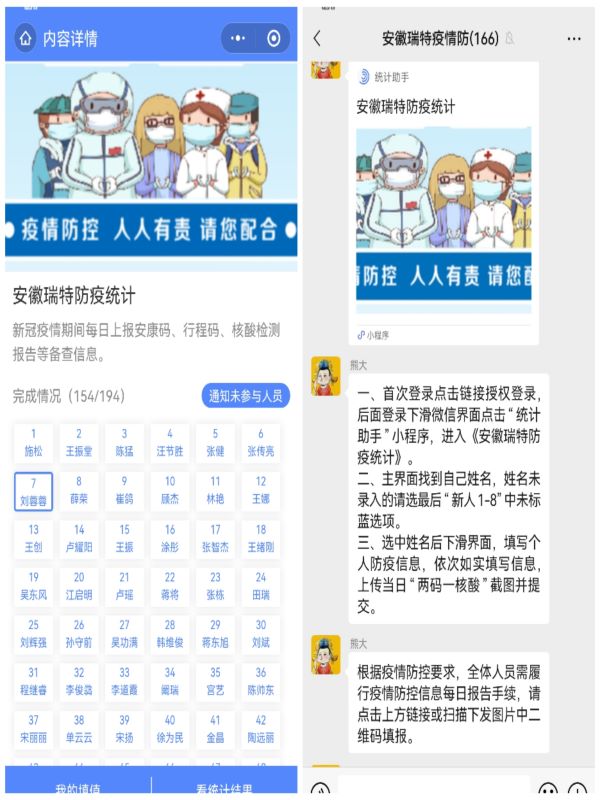 疫情就是命令,防控就是責任。安徽瑞特黨員干部和職工積極響應(yīng)黨組織號召,主動報名參加廠區(qū)疫情防控24小時值班工作,輪流奮戰(zhàn)在防控疫情的最前沿,逐人逐車檢查“雙碼”。同時嚴格落實屬地“三天一次核酸檢測”防疫政策,以實際行動助力疫情防控工作。通過召開安徽瑞特疫情防控生產(chǎn)協(xié)調(diào)會,分析研判疫情對生產(chǎn)經(jīng)營的影響,逐項制定保供保產(chǎn)措施預(yù)案。為進一步加強防疫登記工作,探索“統(tǒng)計助手”微信小程序,實現(xiàn)全員線上填報員工每日健康信息,進一步筑牢疫情防控安全防線。